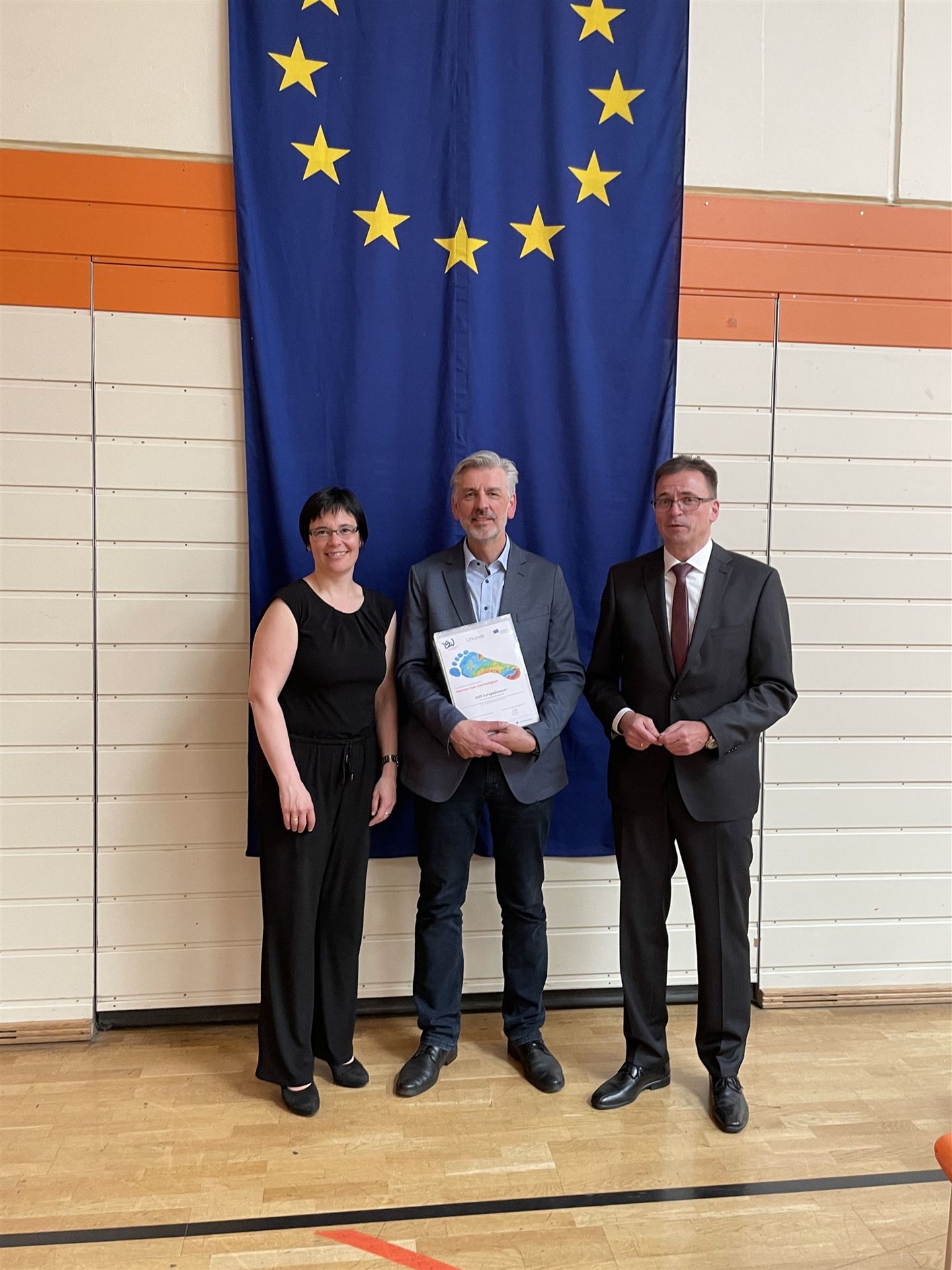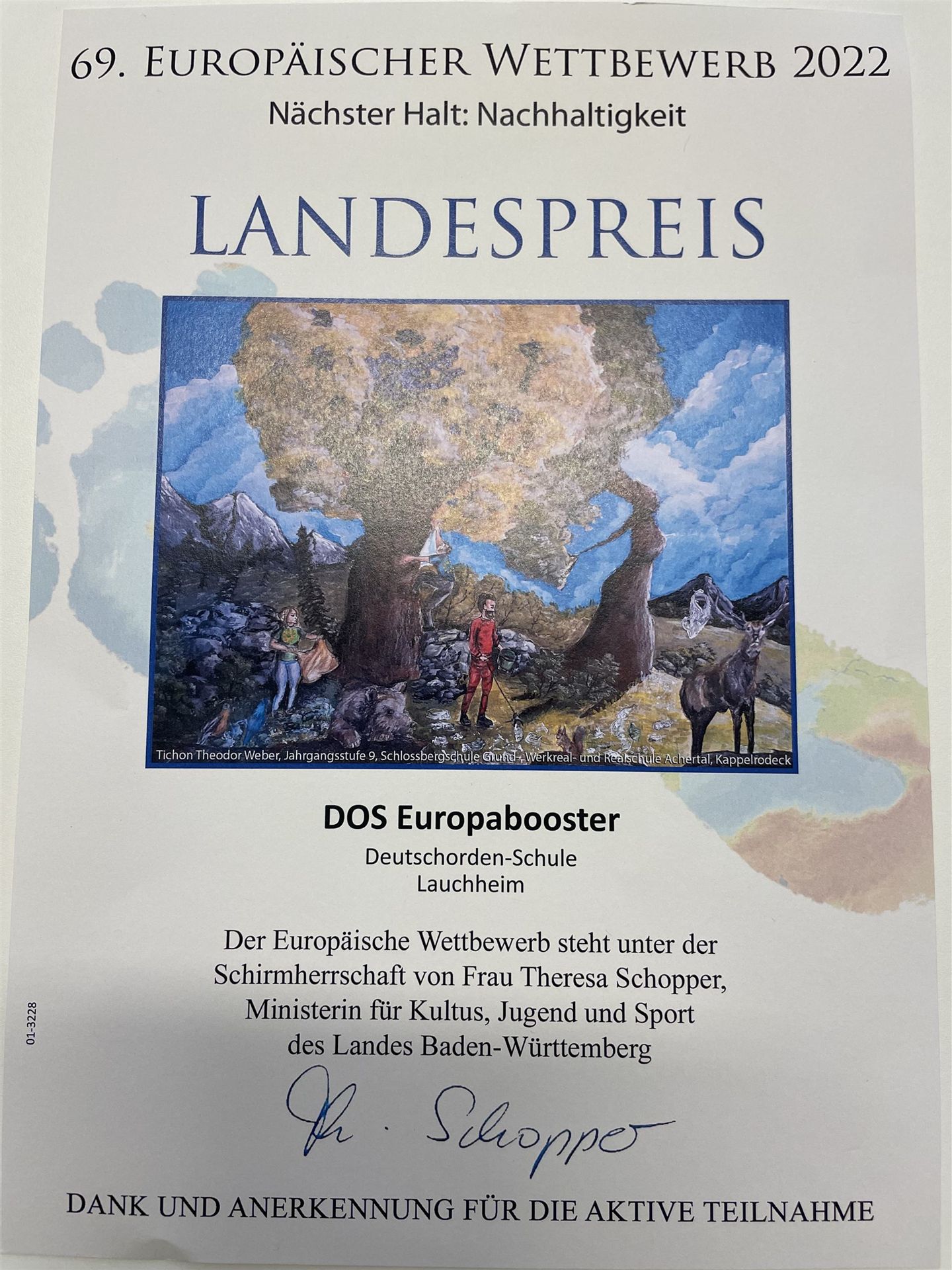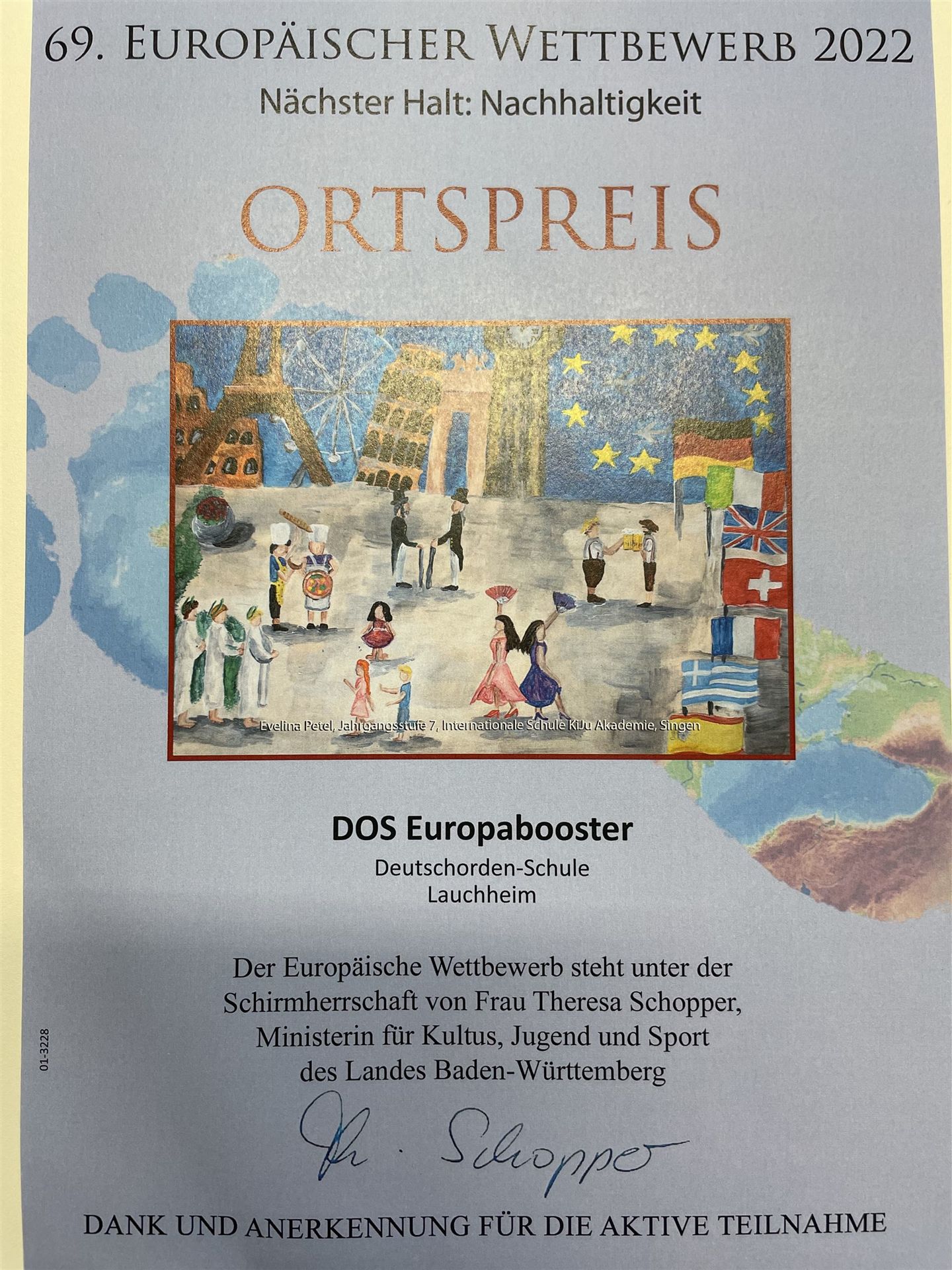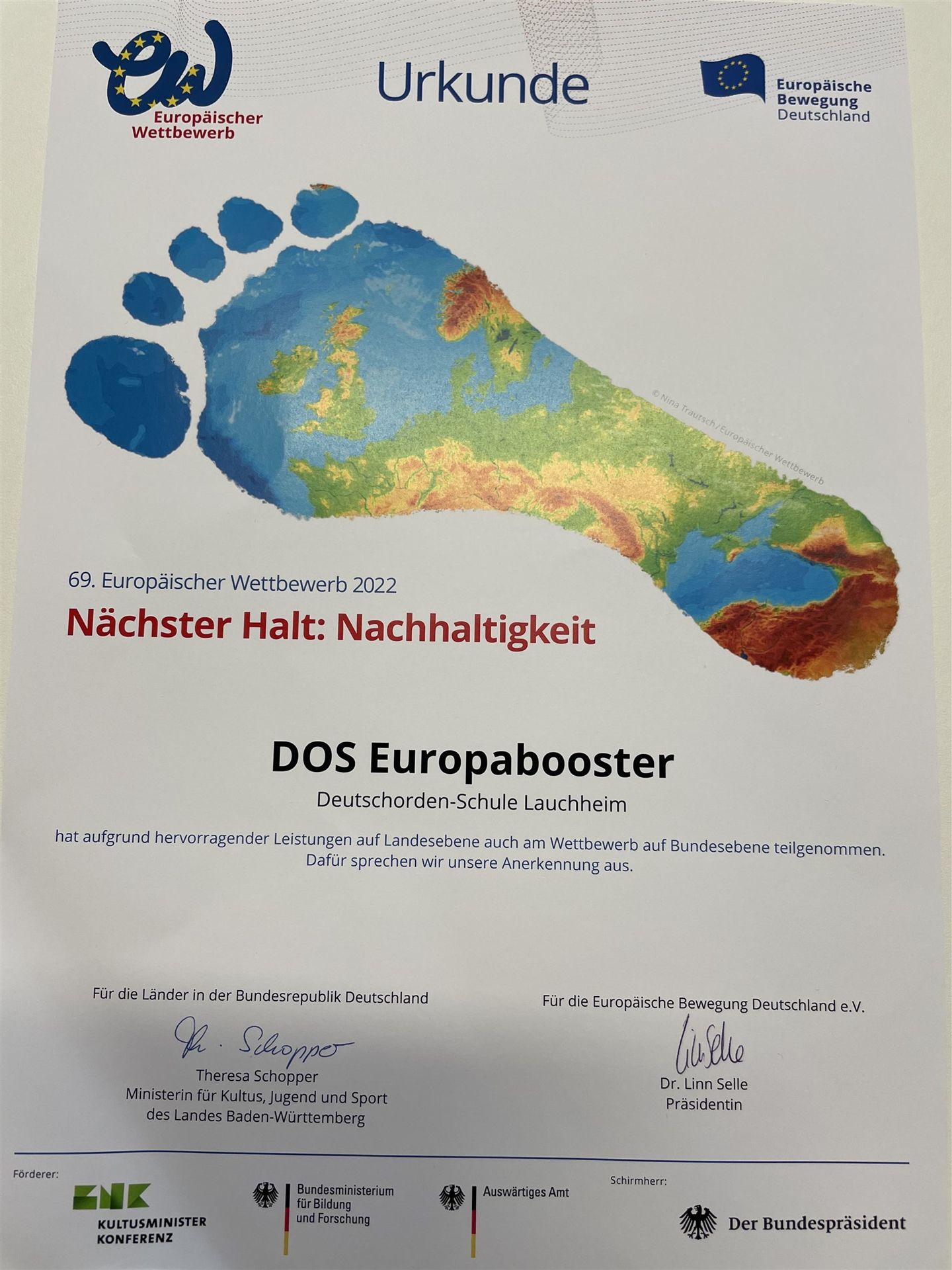 Für das „Europalied“ der Gruppe „Europabooster“ erhielten die Schülerinnen und Schüler unter der Leitung von Frau Katharina Frattollino und Herr Wolfram Hirsch einen Landespreis mit Bundespreisnominierung.
