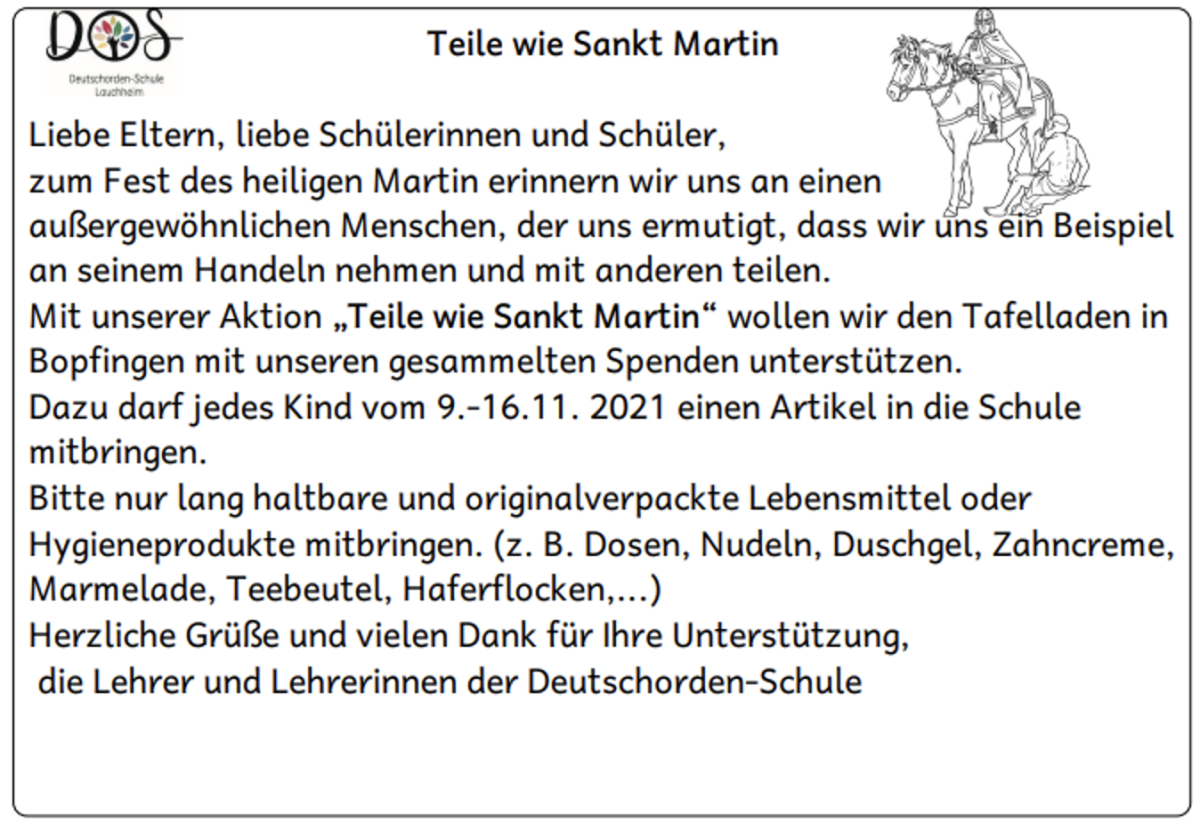 Am Freitag, den 25.März 2022 veranstaltete der Förderverein zusammen mit der Deutschorden-Schule eine Sammelaktion für Schulbedarf zugunsten ukrainischer Flüchtlingskinder. Aufgrund der hohen Spendenbereitschaft, konnten wir unglaubliche 40 Schulranzen und viele weitere Schulmaterialien wie Turnbeutel, Mäppchen, Hefte, Stifte, Wasserfarben … sammeln. Ein großer Dank gilt allen Helfern, die zum Gelingen dieser Aktion beigetragen haben und natürlich allen Spendern. Herzlichen Dank auch für die Geldspenden, die für die Initiative Integration Lauchheim eingegangen sind.